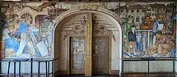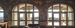 Lucien Labaudt painted the elaborate San Francisco Life fresco mural in 1936 and 1937.[5] The mural extends from the top of the wainscot to the ceiling of the first floor entrance lobby and wraps around all four walls, split into nine sections, each approximately 9 ft (2.7 m) tall and covering an aggregate area of 1,500 sq ft (140 m2).[10] It depicts real people and scenes from San Francisco in the 1930s, encompassing the beach, Golden Gate Park, Fisherman's Wharf, and the Marina District.[14]