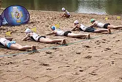 The game is played by sticking a series of flags (typically short lengths of hosepipe) into the sand in a row. The competitors lie facing away (and face down) approximately 20 metres away. Upon a starting signal, the competitors race to the flags and try to grab one. The difficulty in the sport is that there are always fewer flags than there are competitors. The competitors who do not manage to capture a flag are eliminated, the flags are reset (removing one more), and the game continues until there is one person remaining - the winner. The game progresses in much the same way as musical chairs. Competitors are also eliminated if they commit a starting infringement by moving between the "heads down heads up" and starting signal usually a horn or just someone yelling go. [1]