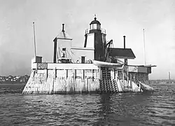 The Beacon Light was first erected in 1828, located in the Saint John Harbour in Saint John, New Brunswick.[1] It sat atop a wooden pier in the harbour and was the second lighthouse in New Brunswick at the time,[2] with a construction cost of £672 3s 3d.[3][4] One of the earliest keepers, William Gold, was appointed in April 1830 and served until his death in April the following year.[5][6] On the morning of January 7, 1867,[7][8][9] the lighthouse was destroyed by fire while the keeper was absent, leaving the harbour completely reliant on Partridge Island's lighthouse.[1] The keeper's two sons, who were present during the fire, managed to save four reflectors before escaping.[2] The Colonial Government took notice of the Beacon Light's temporary discontinuation due to the fire.[10][11]
