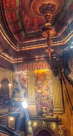 The side walls of the orchestra contain ornate arched doorways. Above each of the arches are theatrical masks, which are flanked by swags and cartouches. Above these arches are the balcony's side walls, which are divided into two bays by fluted pilasters. Each bay contains a piece of a mural by Kjoldgaard; according to the New York City Landmarks Preservation Commission, these represent "oriental scenes with caravans of elephants, camels, and traders".[12][19] The ceiling above the front of the auditorium contains a red, gold, green, and blue color scheme and is designed to resemble the draped roof of a tent. A Venetian-style chandelier hangs from the center of the ceiling.[12][19]