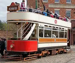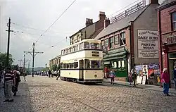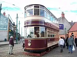 After seeing regular use as an engineering tram, in July 1984 it was placed on long-term loan to the museum, with the intention of restoring it to its 1920s condition (open top, open platform double-decker).[21] It entered service in 1988,[22] being used in the summer seasons.[21] it returned to Blackpool for the 1998 summer season only, to take part in the Blackpool – Fleetwood Tramway centenary celebrations.[21] The tram was withdrawn for overhaul in 2016. This work involved attention to the motor, controllers and the paintwork and was completed in 2018.