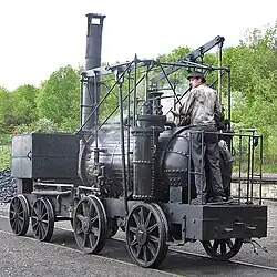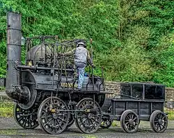 Locomotion No. 1 is a replica of an original locomotive which was designed by George Stephenson and built in 1825 for the Stockton and Darlington Railway, which made it the first steam locomotive to carry passengers on a public rail line. The Beamish replica was completed in 1975 for the 150th anniversary of the S&DR. The original survives as a static exhibit, having eventually become part of the National Collection held by the National Railway Museum, who have placed it on long-term loan to Head of Steam (a museum on the route of the S&DR).[6][7] This locomotive is currently out of use as its boiler certificate has expired. It is currently on static display at the National Railway Museum Shildon and is awaiting overhaul.