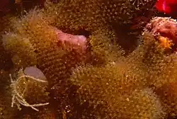 Beania magellanica often grows as an epibiont on sponges, gorgonians or coralline algae. It is also a fouling organism, attaching itself to the hulls of boats, and possibly rafting from one location to another on floating debris.[2] Like other bryozoans, the zooids feed on diatoms and organic particles which the lophophores extract from the water flowing past. The food particles are passed to the central mouth. A colony's zooids are interconnected, enabling them to share food with each other. Colonies expand by budding off new zooids. Under certain circumstances, specialised reproductive zooids develop. The embryos are brooded at first and then have a short planktonic larval stage, before settling on a suitable substrate to found a new colony. Various sea slugs feed on the zooids, and this bryozoan is intolerant of pollution by heavy metals such as copper.[3]