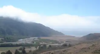 Bear River is the largest Pacific coastal drainage basin between the Mattole River and the Eel River. Bear River drains the ranch pastures and forests of California Coast Ranges south of the Bear River Ridge extending easterly from False Cape along the False Cape shear zone of the Russ Fault. The river channel through undivided Cretaceous marine formations exposes younger Neogene, namely middle or lower Pliocene, marine sedimentary and metasedimentary rocks near the mouth, but lacks the well defined offshore submarine canyons of the Eel River to the north and the Mattole River to the south.[2] Bear River reaches the Pacific after flowing westerly approximately 20 miles (32 km) from elevations above 2,000 feet (600 m) along the ridge above the Bull Creek drainage of Humboldt Redwoods State Park.[3]: map 38 Bear River provides the recreational and industrial water supply for the community of Capetown, California, and wildlife habitat including cold freshwater habitat for fish migration and spawning.[4]