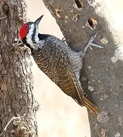 The bearded woodpecker (Chloropicus namaquus) is a species of bird in the family Picidae. It has a distinctive black and white head and brownish barred body. It is native to tropical central Africa. It has an extremely wide range and is a fairly common species, and the International Union for Conservation of Nature has rated its conservation status as being of "least concern".[1] Some taxonomic authorities place this species in Dendropicos.