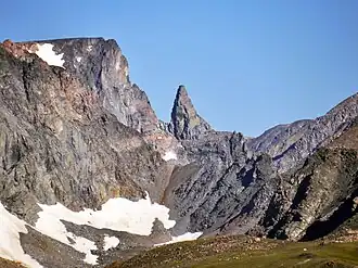 Bears Tooth (11,920 feet (3,630 m)) is a mountain spire in the Beartooth Mountains in the U.S. state of Montana.[3] The peak is in the Absaroka-Beartooth Wilderness in Custer National Forest, and is adjacent to Beartooth Mountain. Bears Tooth is the namesake for numerous other points in the region and the Beartooth Mountains themselves. Known by the Native American Crow as "Na Piet Say", translated as bears tooth, the spire can be seen from the Beartooth Highway.[4]
