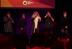 ![]() The Beatbox House's showcase on Grand Beatbox Battle 2018. (from left to right : Chris, Amit, Kenny, Gene and NaPoM) | |