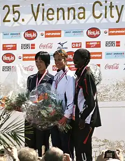 She ran two marathons in 2006, taking third place on the podium at both the Nairobi and Madrid Marathon. A season's best in the half marathon came at the Berlin race, where her time of 1:11.35 was enough for fourth. She was third at the Marrakech Marathon and second at the Paderborner competition that year.[6] In 2007, she claimed third place at the Hamburg Marathon with a run of 2:30:46 hours and also won the Paderborner Half Marathon and Nacht von Borgholzhausen 5-mile races.[15][18] Her last season of competition was 2008: she had podium finishes at the Vienna City Marathon and Marathon De La Rochelle in France.[6] She also ran at the Berlin Half Marathon, coming sixth,[19] and was third at the 20 van Alphen. In October, she won the Bredase Singelloop.[20]