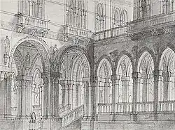 Scene 1: "Gallery in the Castle of Binasco ready for the sitting of a tribunal. Guards at the door"