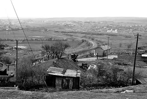 Beaufort station was situated in a cutting to the west of a road bridge.[13] It stood opposite the Beaufort Ballroom and adjacent to the Beaufort Arms Public House. It had two platforms accessible by flights of steps leading down from the road bridge.[14] The main station building was built of stone, with a timber waiting shelter was provided on the opposite platform.[9] As Beaufort is situated 1,200 feet (370 m) above sea level, harsh winters such as that of 1946-47 could result in the cutting being blocked with snow.[15] The line to Ebbw Vale closed on 2 April 1951.[16][17] The Abergavenny line was the next to close when passenger services ceased on 4 January 1958.[18] The last passenger service over the line was an SLS railtour on 5 January 1958 hauled by LNWR 0-8-0 49121 and LNWR 0-6-2 tank 58926'[18][19] Final closure came on 2 November 1959 when coal traffic from Tredegar ceased.[9][20]