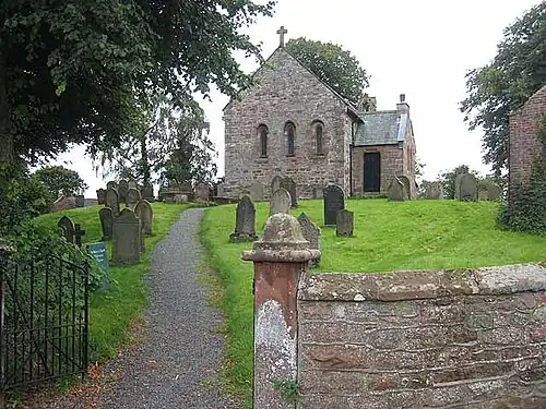 The building is constructed from squared and coursed sandstone from the nearby wall, the line of which runs directly beneath the church, with a graduated roof made from greenslate, coped gables and a cross finial. Little remains of the original church although the single chamber interior is still mostly of the earlier period, notably the south doorway and three east windows, but the church underwent restorations in 1784, 1872 and 1888.[9] The single chamber is still mostly of the earlier period, notably the south doorway and three east windows. The windows, porch and vestry are 19th-century restorations, and the king post open timber roof dates from the 15th century. Hadrian's Wall Path passes the church, on its way from Carlisle to Bowness-on-Solway (via Grinsdale and Burgh-by-Sands).[10] The church became a Grade II listed building on 1 May 1957.[9]