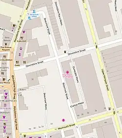 Beaumont Street is a street in the City of Westminster, London, that runs from Marylebone High Street in the north to the junction of Westmoreland Street and Weymouth Street in the south. The street is crossed midway by Devonshire Street and Clarkes Mews adjoins Beaumont Street on its eastern side at the southern end.