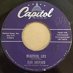 "Beautiful Lies" is a song written by Jack Rhodes and recorded by American country singer Jean Shepard. It was released in September 1955 by Capitol Records as a single. It became Shepard's fifth top ten single on the US country chart in her career and was given positive reception by critics.