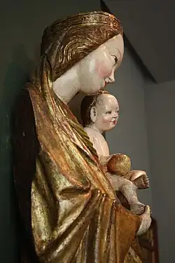 This sculpture was made at the beginning of the 15th century by an unknown artist. The sculpture is 119 centimetres (3 ft 11 in) high and can be viewed from three sides; the rear side is deeply hollowed to avoid cracking of the drying timber. This piece shows the Virgin Mary with a nude Baby Jesus holding an apple. The Virgin stands with an S-curve, and her clothes are richly pleated.