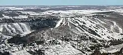 It is situated on a steep sided section of the Niagara Escarpment adjacent to the Bruce Trail. It features some of the steepest runs and most diverse terrain in the region. The Club has 28 trails, five snowparks including a championship snowboard/ski cross course,[3][4] national level mogul and slopestyle runs,[5][6][7] glade skiing and a ski bowl. Its Playground snow park is one of the longest full featured snow park runs in Ontario.[8] The Club has six lifts, two lodges, and a ski and snowboard shop with rentals.