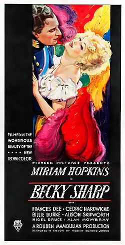 Becky Sharp is a 1935 American Technicolor historical drama film directed by Rouben Mamoulian and starring Miriam Hopkins, who plays the eponymous protagonist. She was nominated for the Academy Award for Best Actress. Other supporting cast were William Faversham, Frances Dee, Cedric Hardwicke, Billie Burke, Alison Skipworth, Nigel Bruce, and Alan Mowbray.[2]
