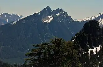 Bedal Peak is a 6,554-foot-elevation (1,998-meter) mountain summit located in the North Cascades, in Snohomish County of Washington state.[4] The mountain is situated in the Henry M. Jackson Wilderness, on land managed by the Mount Baker-Snoqualmie National Forest. The nearest higher neighbor is the line parent Sloan Peak, 2 mi (3.2 km) to the south-southeast. Precipitation runoff from the peak drains west to the South Fork Sauk River via Bedal Creek, as well as north and east into tributaries of the North Fork. The north and south forks merge at the northwest base of the mountain to form the Sauk River. Topographic relief is significant as the summit rises 5,250 feet (1,600 meters) above the Sauk River Valley and Mountain Loop Highway in approximately two miles.