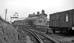 Although the section between Bedale and Leeming was doubled by the turn of the century, the station never received a second platform, and the line became single again before passing through the adjacent level crossing.[4] However, goods trains could be left on the line without a platform to allow passenger services to take priority on the line.[5] Services were always modest at best, with a basic timetable of between five and seven trains each way operating right up until the closure of the line to passengers in April 1954.[6]