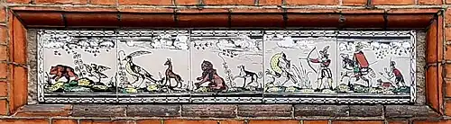 Characteristic features of the houses are red brick, walls hung with tiles, gables of varying shapes, balconies, bay windows, terracotta and rubbed brick decorations, pediments, elaborate chimneys, and balustrades painted white.[12] The eclectic approach is well seen in the estate church of St Michael and All Angels, where Shaw has incorporated Arts & Crafts, Georgian, medieval, Tudor, and Wren styles.[1]