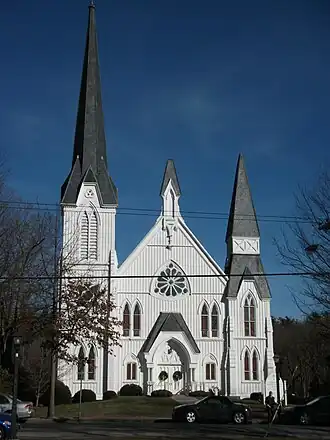 Today's Presbyterian Church on the village green was built in 1872 as the fourth on the site. The first minister, Reverend Thomas Denham, settled in 1684, and a meeting house was built in 1689. When Bedford became part of New York, this house was transferred to Rye, New York. Bedford was part of the Anglican Church until the Revolution. A second meeting house was burned by the British in 1779. A third house was transferred to Westmoreland Sanctuary. The fourth church was built in 1872.[10]