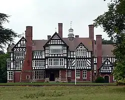 The red brick and black-and-white timbered house was built between 1882 and 1884, to a design by architect Thomas Harris, for Sir Henry Ripley,[1] a wealthy Yorkshire industrialist and Member of Parliament. The multi-gabled three-storey house has wooden mullioned and transomed windows and is a "calendar house", reputed to have 365 windows, 52 rooms (on the first 2 floors), 12 chimneys and 7 external doors.[1] The central hall has a 52-panelled stained-glass window depicting the months of the year, signs of the zodiac, birds associated with the months and agricultural activities of the months.