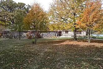 The CCC worked from 1934 to 1938 developing the park. They set up camp in the Franklin County Fairgrounds. The dam and spillway were constructed between 1934 and 1936. They began filling the lake by August 1937. Five fish rearing ponds were created from 1936 to 1937 to the east of the lake on 15 acres (6.1 ha) bought by the State Board of Conservation in 1935. A causeway was created on top of the old dike. The bathhouse was built between 1935 and 1936, and a footbridge was built in 1937. The beach adjacent to the bathhouse was completed in October 1936. The boulders for the spillway and bathhouse construction came from adjacent fields. Other minor structures, which include a flagstone walk and roadways, are also considered historic and were built by the CCC. The park officially opened on June 5, 1938. The non-contributing structures were all built after the CCC's involvement.[3]