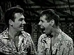 During the 1950s, comedian Sammy Petrillo had established something of a career by imitating comedian Jerry Lewis, whom he closely resembled. Petrillo worked for Lewis at one point after an agent set up a meeting with Lewis who then cast him in a sketch on the NBC show The Colgate Comedy Hour. For $60, he played Jerry Lewis as a baby in a crib.[3] Petrillo went on to form a musical comedy team in the style of Martin and Lewis with singer Duke Mitchell in the Dean Martin role. The team played in various clubs in Las Vegas among other cities. Maurice Duke, who managed the duo, had pitched the idea of Petrillo and Mitchell starring in a movie to several studios. Duke eventually pitched the idea to Realart Pictures Inc. co-owner Jack Broder and his assistant, producer Herman Cohen. Maurice Duke then took Broder to see Mitchell and Petrillo perform in Culver City. While Broder thought the duo was hilarious, Cohen (who saw the duo's act later) said he thought Mitchell and Petrillo "stunk".[4] Bela Lugosi Meets a Brooklyn Gorilla was to be the first in a series of films starring Mitchell and Petrillo, but wound up as their only film together.[5]