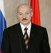 The 1994 Belarusian presidential election marked a significant conflict between pro-Russian and pro-Western groups of nationalists. In the former camp was Alexander Lukashenko, a collective farm manager from the country's east. In the latter camp were Pazniak and Shushkevich.[40] Lukashenko won the election and soon set out reversing the trends of Belarusianisation which had been carried out by the government from 1991 to 1994. In 1995, Lukashenko held a referendum to establish Russian as a co-official language with Belarusian and restore the symbols of the Byelorussian SSR. The referendum succeeded with 64.8% turnout, though the results were widely condemned as rigged by the opposition and the Organization for Security and Co-operation in Europe. For his part, Lukashenko claimed that he was not involved in Russification, instead blaming Masherov.[40]