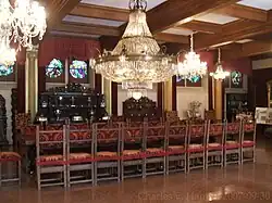 Inside the castle was just as magnificent and somewhat eccentric. Belmont housed his vast collection of horses and carriages on the ground floor, accessed by two huge carriage entrances on either side of the north façade. To the west of this vast area was Belmont's Francis I Renaissance-style Grand Hall and foyer, which exited onto Ledge Road.[7] The monumental Gothic rooms with their huge stained-glass windows were emblazoned with the Belmont coat of arms. The room's original damask, blood red in color, has long since been replaced with the same fabric in gold.