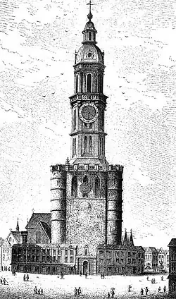 The Belfry of Brussels (French: Beffroi de Bruxelles; Dutch: Belfort van Brussel) was a medieval bell tower in central Brussels, Belgium. Built long before the city's current Town Hall on the Grand-Place/Grote Markt (Brussels' main square), whose tower it should not be confused with, it formerly stood in front of the Church of St. Nicholas until its collapse on 25 July 1714. It was never rebuilt.[1][2]