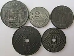 As a consequence of the German occupation in 1940, the silver coinage was discontinued. In 1941, zinc replaced all other metals in the 5, 10 and 25 centimes, and 1 and 5 francs. In 1944 the Allies minted 25 million 2 franc coins at the Philadelphia Mint using leftover planchets for the 1943 steel cent.