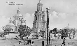 Like many Russian cities, Belgorod began as a fortified settlement. The oldest Belgorod fortress was built at the end of the 16th century on a chalk mountain. According to scientific excavations and surviving archival data, the first fortress outpost was erected in 1596.[20] The site of the construction of the defensive facility was the top of the Belaya Gora ("White Mountain"). This is the highest point of the right bank of the Seversky Donets channel. On 17 September 1650, voivode Vasily Petrovich Golovin laid the foundation for the third Belgorod Fortress on the left bank of the Vezenitsa River, which flows into the Seversky Donets.[21] In the fall of 1650, a wooden fort with 11 towers was attached to the rampart of the Belgorod line, which runs from the fortress town Bolkhovets to the mouth of the Vezelka River in the area of the former brewery. The two parts of the city were connected by the Nikolskaya Passage Tower located in the eastern wall of the Kremlin. The position of the eastern wall of the Kremlin corresponded to the modern street of the 50th anniversary of the Belgorod Oblast. With the expansion of the borders of the Russian state, the military significance of the Belgorod fortress gradually decreased and by the middle of the 18th century, only the Kremlin remained from the formidable fortress.[22]