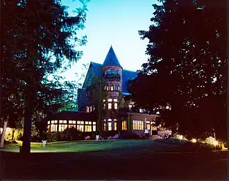 Belhurst Castle is a former private residence on the shores of Seneca Lake in Geneva, New York, United States. It was designed by architects Fuller & Wheeler and built between 1885 and 1889. The three-story, nine bay wide Romanesque Revival style mansion is constructed of Medina sandstone. It has a slate gable roof, one-story solarium, and four rectangular stone chimneys. It features projecting porches, bays, towers with conical and pyramidal roofs, eyebrow windows, and a porte cochere with Syrian arch.[2]: 2