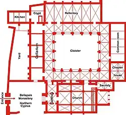 Bellapais Abbey (also spelled Bellapaïs)[1] is the ruin of a monastery built by Canons Regular in the 13th century on the northern side of the small village of Bellapais, in Northern Cyprus, about five kilometres from the town of Kyrenia. The ruin is at an altitude of 220 m above sea level, and commands a long view down to Kyrenia and the Mediterranean sea.
