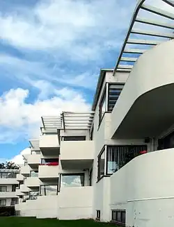 The buildings are built of brick with a whitewashed finish and iron girders between the floors. The roofs are tar-papered, the window frames are teak and the balconies have reinforced concrete fencing. In order to take full advantage of the sea view, Jacobsen staggered the facades of the north and south wings so that each apartment has two rooms with views over the sea.[1] The sea can also be seen from the balconies which are integrated into the structure of the buildings rather than protruding outwards as was the usual practice at the time. The south wing which stands on lower ground has a basement with garages. The largest apartments are those in the west wing, behind the two others and parallel to the coast road, where there is no requirement for a staggered facade. A few shops were also included in the complex. Jacobsen succeeded in creating interesting effects with his floor displacements, rounded corners, and the latticework over the balconies. The shadows over the white surface of the buildings create ever changing impressions as the day progresses. With their white-washed facades and corner windows, the buildings instill an atmosphere of exotic, elegant modernity, so typical of Functionalism. Bellavista allowed Jacobsen to realize his dream of a modern town.[1][5]