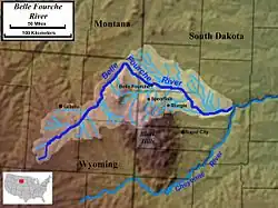 The Belle Fourche River (pronounced bel FOOSH; Lakota: Šahíyela Wakpá[1]) is a tributary of the Cheyenne River, approximately 290 miles (470 km) long, in the U.S. states of Wyoming and South Dakota.[2] It is part of the Mississippi River watershed via the Cheyenne and Missouri rivers. In the latter part of the 19th century, the Belle Fourche River was known as the North Fork of the Cheyenne River.[3] Belle Fourche is a name derived from French meaning "beautiful fork".[4]