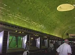 The aquarium reopened to the public on August 18, 2012, and is now run entirely by Belle Isle Conservancy, a 501(c)3 non-profit partner to Belle Isle park.[6] The 10,000-square-foot (930 m2) historic building features a single large gallery with an arched ceiling covered in green glass tile to evoke an underwater feeling.[1][7]