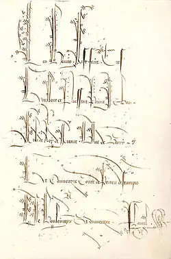 The Duke commissioned several lavish Books of Hours, including the most famous, the Très Riches Heures, parts of the Turin-Milan Hours, the Petites Heures of Jean de France, Duc de Berry and the Belles Heures. The Belles Heures is larger than the Très Riches Heures. It is known to have been created for Jean de Berry because it has an inscription by Jean Flamel, the duke’s scribe, stating the commissioner as "Prince John, ..., Duke of Berry...".[2] Furthermore, numerous times throughout the Belles Heures, the Duke of Berry’s heraldry, emblem, and motto appear on some of the pages and illustrations.[2] Also, because of the private nature of the book, the artists included many depictions of the Duke of Berry within the manuscript itself.
