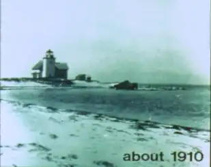 The island continued to erode away with heavy flooding of the tower itself in 1873, 1875, and 1882.[3] The lighthouse keeper died in the flooding of 1875. More than 1,000 feet (300 m) of sea wall was built in 1888 to protect the lighthouse, but erosion continued at a fast pace. Early in the 20th century the last families moved off Billingsgate, leaving only the lighthouse keeper and a man who guarded the shellfish beds. Many of the houses on the island were floated across the harbor to Wellfleet on rafts to prevent their loss. (Some are still standing and are known locally as Billingsgate cottages.) The 1858 lighthouse was abandoned in 1915 and destroyed by a storm in December of the same year. The last light tower was torn down in 1922.