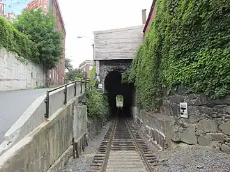 The Bellows Falls Tunnel is a railroad tunnel located in center of the Village of Bellows Falls within the Town of Rockingham, Vermont, adjacent to the Connecticut River, and is currently owned and operated by the New England Central Railroad (NECR). The Vermont Valley Railroad originally constructed the tunnel in 1851. Partially cut through solid rock, the tunnel was built with rough-cut stone blocks, where each portal was decorated with radiating voussoirs around their horseshoe shaped arches. The stone blocks average about 18 inches deep as observed at the tunnel portals. Record information available from the NECR would indicate that a separate support system exists above the masonry tunnel supporting the hotel building to the north of the Bridge Street roadway[1] which is also directly above, and crosses perpendicular (east/west) to the tunnel below.