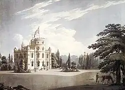 The house was designed as an imitation of a medieval baronial castle with battlements and a four-story tower overlooking the River Thames. Early visitors commented on the luxuriousness and elegance of its interior fittings which matched the neo-Gothic style of its exterior. The library was oval shaped with fitted book cases and mouldings and opened out to a double flight of stone steps descending to a terrace. Its grounds contained a large walled kitchen garden which included fruit trees and a hothouse. Surrounding the house were extensive pleasure grounds, landscaped with forest trees, shrubs, and plants. These terminated on the west side at a Gothic temple and on the east with an orchard and paddock. The house had two approaches: the first from a lodge (also built in the Gothic style) on the south lawn near the road between West Thurrock and Grays, and the second from the north lawn via the road from Stifford village.[10] The estate was situated over a medieval rural settlement and had several dene holes which were covered over during the landscaping of the pleasure grounds.[11]