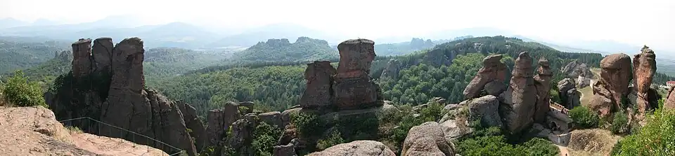 The Belogradchik Rocks are spread over the western part of the Balkan Mountains and cover an area of 50 km2 (19 sq mi). They extend from the village of Rabisha in the west to the village of Belotintsi in the east.