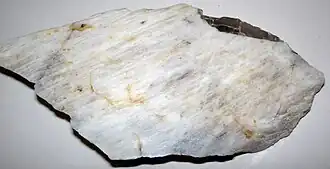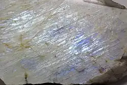 Belomorite (Russian: Беломори́т — from the toponym),[2] sometimes peristerite or moonstone, also murchisonite, Ceylon opal, hecatolite — a decorative variety of albite (oligoclase) of white or light gray color with a distinct iridescence effect. By composition, belomorite belongs to the feldspar family; it is a sodium aluminosilicate from the plagioclase group, in most cases belonging to the isomorphic series albite (Ab) — anorthite (An) with an approximate percentage of 70Ab-30An.