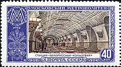 Belorusskaya (Russian: Белору́сская) is a station on the Moscow Metro's Koltsevaya line. It is named after the nearby Belorussky Rail Terminal. It opened in 1952, serving briefly as the terminus of the line before the circle was completed in 1954. Designed by Ivan Taranov, Z. Abramova, A. Markova, and Ya. Tatarzhinskaya, the station has low, white marble pylons, an elaborately patterned plaster ceiling, light fixtures supported by ornate scroll-shaped brackets, and a variety of decorations based on Belarusian themes.