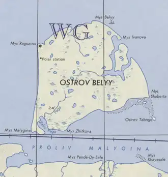 Bely Island (also spelled as Belyy and Beliy, Russian: Белый остров) is a relatively large island in the Kara Sea off the tip of the Yamal Peninsula, Siberia, Russia.[1] Close to the island's northwest tip, there is the Russian Experiment Station (Polyarnaya Stantsiya) Popov Station.