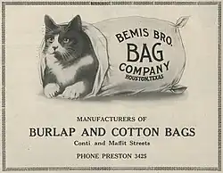 The mascot for Bemis Brothers Bag Company was a cat named Biddy. The logo printed on their bags was drawn from a cat (and "excellent mouser") in their first factory. Judson viewed the logo as communicating that Bemis would deal fairly with its customers by "letting the cat out of the bag". Several sculptures of Biddy were displayed at their second branch in Omaha.[11]