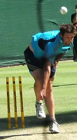 Hilfenhaus returned to the Test side when it travelled to England where they would face Pakistan in two Tests in July. His knee was still painful, but Hilfenhaus played regardless.[24] The series was drawn 1–1 and Australia's fast bowlers were often inconsistent.[25] Hilfenhaus was Australia's second highest wicket-taker in the series, with eight at an average of 23.75.[26] In October Australia toured India for two Tests and Hilfenhaus was included in the 15-man squad.[27] At this point, India were the number one ranked Test team in the world and Australia had dropped to fourth.[28] India won both Tests and Hilfenhaus' six wickets for 261 runs made him Australia's second highest wicket-taker in the series.[29][30]
