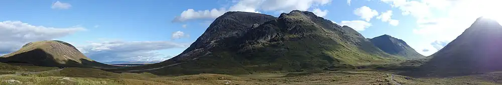 The Black Mount is situated between Glen Orchy and Glen Coe, to the east of Glen Etive, forming the southernmost part of the national scenic area. Its four Munros are Stob Ghabhar, Stob a' Choire Odhair, Creise and Meall a' Bhuiridh.[22] The hills of Ben Inverveigh and Meall Tairbh are located between Black Mount and the Bridge of Orchy.[23] The Black Mount Deer Forest includes moorland, the mountain, as well as several rivers, burns, lochs, and tarns.[24]