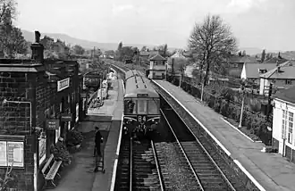 Ben Rhydding station, built as part of the Otley and Ilkley Joint Railway, was opened to passenger traffic on 1 July 1866, eleven months after the opening of the railway. Originally the station was to be called Wheatley, the name of the village, but the influence of the Ben Rhydding Hydro establishment, saw a name-change on account of those using the station to visit the hydro.[7][8] In April 1865 the North Eastern Railway Board had "ordered that a small wooden station consisting of booking office, waiting room and retiring room for ladies be provided as a temporary accommodation at Ben Rhydding."[9] Six years later, in May 1871, the Joint Committee reached an agreement with the proprietor of the Ben Rhydding Hydro, that a more permanent station structure should be built at the expense of the Hydro, with a ground rent of a penny per annum, so long as the structures met the approval of the railway engineer, a Mr. Crossley. The Hydro's arrangements with the company lasted until 1885, when the structures – a stone built station house on the south (down) platform and a wooden structure on the north (up) platform – were sold to the railway company for £240.[10] Clients of the hydro were met by the hydro's horse-bus, and later by motor-bus, up until some time after the first world war.[9] The station was opened to goods traffic in 1888, and trailing access sidings were provided on the down side for this purpose.[11] A new signal box was opened in 1901, situated at the Ilkley end of the northern platform.[11] The signal box closed in December 1965. Goods traffic ceased on 5 July 1965, and the sidings later removed. Station staff were withdrawn on 7 October 1968, when 'pay-trains' were introduced.[12] The stone station building has subsequently been demolished, and shelter on both platforms is restricted to simple bus-stop type covered areas. Electrification of the Wharfedale Line was undertaken by British Rail between 1994 and 1995 and is of the standard 25kV overhead supply.[13]