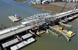 A $32.5 million[7] rehabilitation of the Ben Sawyer Bridge was approved by the South Carolina Department of Transportation (SCDOT) in August 2008.[8] The rehabilitation was tendered as a Design/build Contract by the SCDOT. The Engineer of Record was Hardesty & Hanover, LLC and the General Contractor was PCL. The project began in January 2009[9] and was completed in February 2010.[10][11] The project included replacement of the aging steel superstructure including the swing-span section with a new swing-span truss and operating machinery retaining the historic look of its predecessor.[1] In addition, each traffic lane was widened from 12 feet to 14 feet, and the 2.5-foot (76 cm) sidewalks on both sides were replaced by a single 5-foot (1.5 m) one on the harbor side only.[1] The bridge closed temporarily on February 7, 2010, for removal of the old span and installation of the replacement span, which was lifted into place from barges using hydraulic jacks on February 11.[1] The bridge reopened to traffic on February 19, 2010.[10]